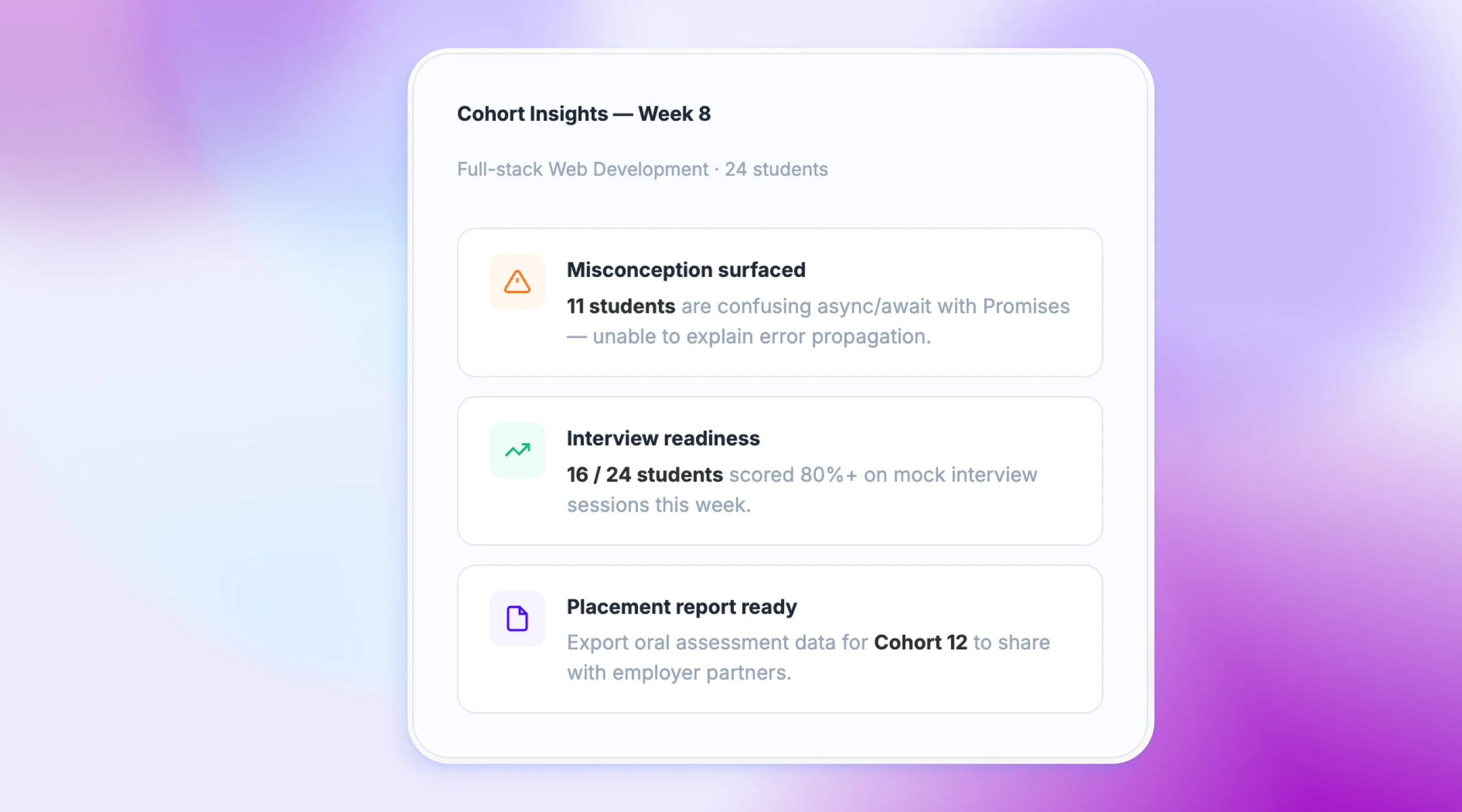 💼 After a student hands in a project, Coral conducts a short oral check. Can they explain the architecture? Do they understand the patterns they used? Did they write it, or just paste it?