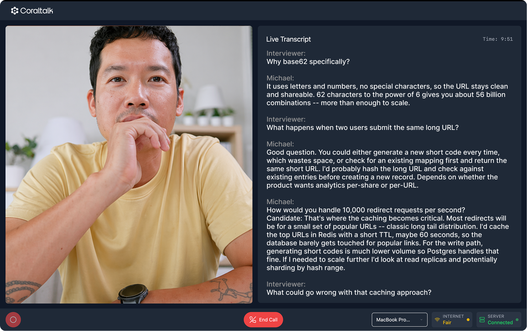 🎓 Students speak through real interview-style questions — explaining their approach, walking through logic, handling edge cases. Coral adapts its follow-ups based on their answers, just like a real interviewer would.